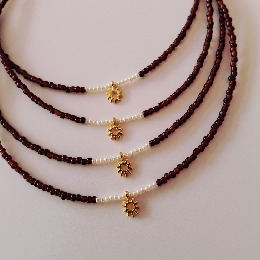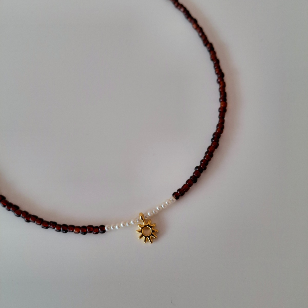 Λεπτό χειροποίητο κολιέ με καφέ χάντρες, περλίτσες και επιχρυσωμένο ήλιο στο κέντρο του (κούμπωμα από ατσάλι)