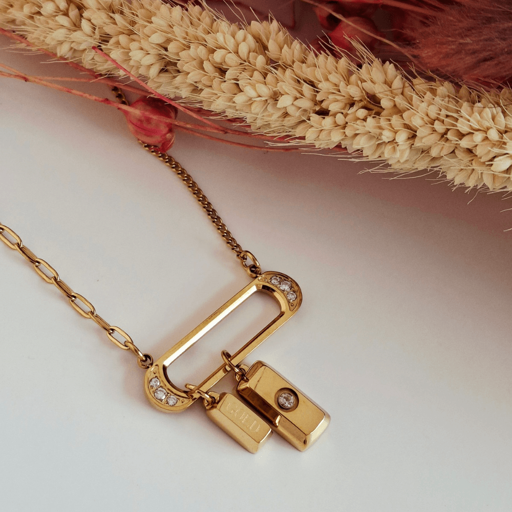 Κομψό και σύγχρονο το κολιέ αυτό συνδυάζει minimal γραμμές με ιδιαίτερες λεπτομέρειες. Η αλυσίδα καταλήγει σε ένα γεωμετρικό στοιχείο διακοσμημένο με μικρά ζιργκόν, από το οποίο κρέμονται charms που χαρίζουν κίνηση και λάμψη