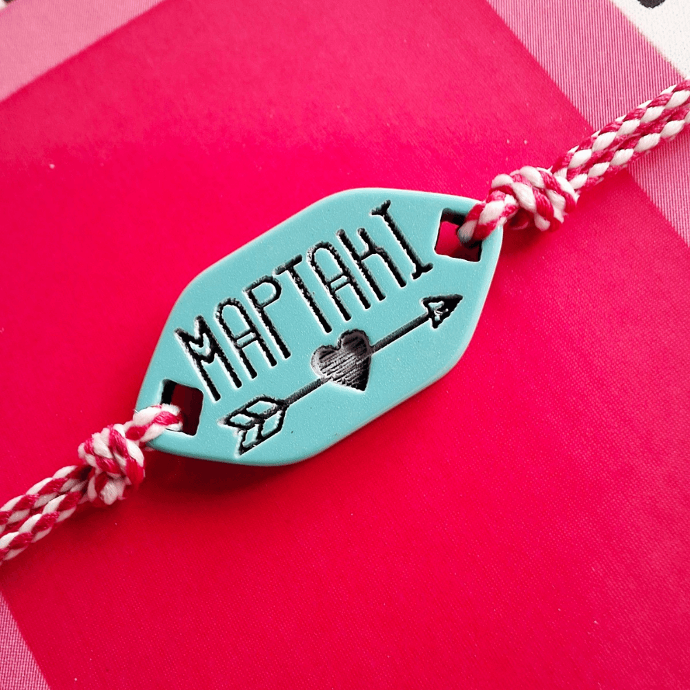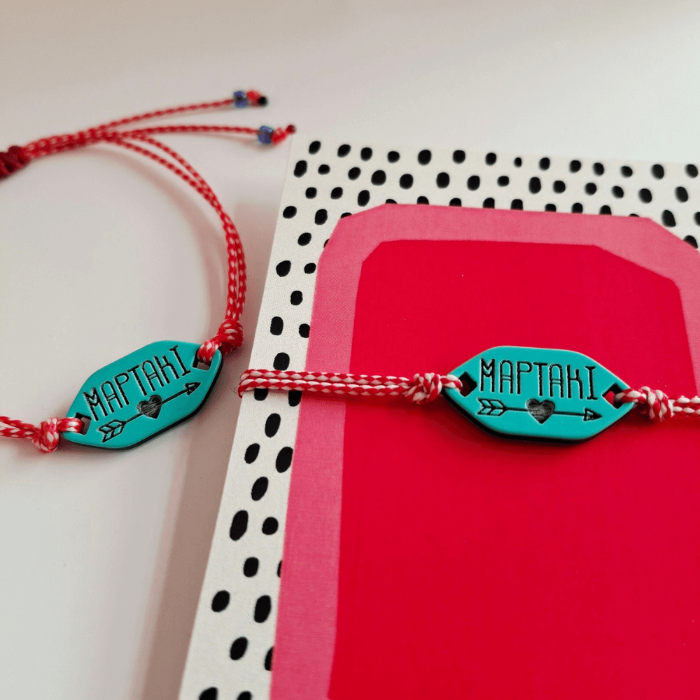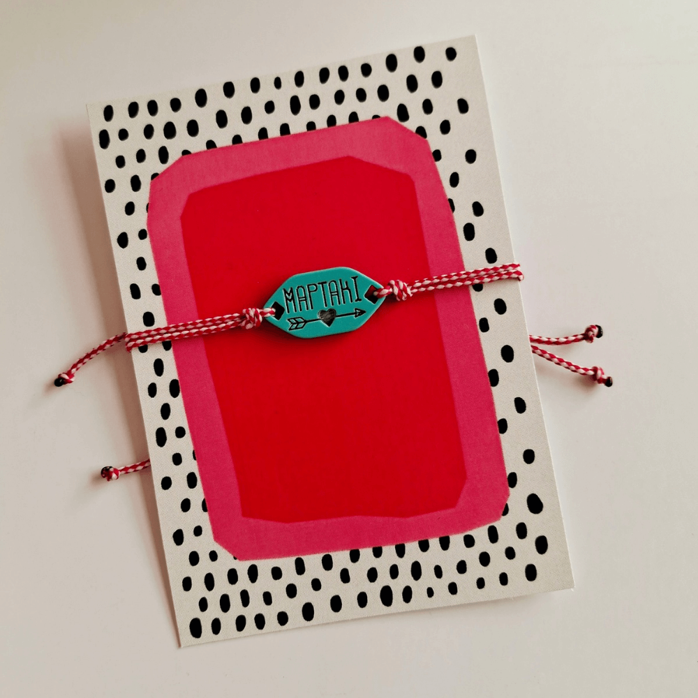 Χειροποίητο μαρτάκι με τιρκουάζ λεπτομέρεια, κόκκινο και λευκό κορδόνι και κούμπωμα μακραμέ.